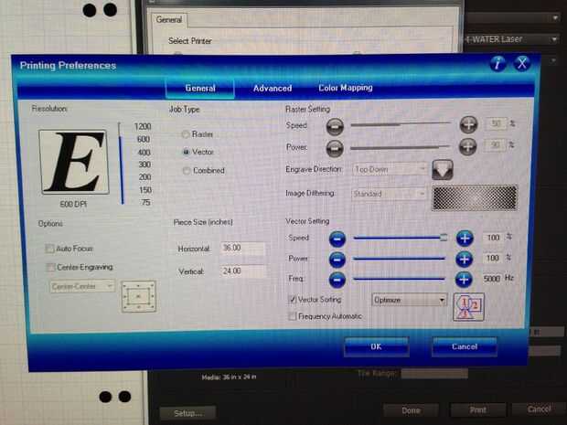 En la configuración de impresora para el corte de Vector único y ajustar la velocidad al 100%. Si eres nuevo en esto, asegúrese de configurar la energía del laser hacia abajo, ya que realmente no hacer cualquier corte por ahora.