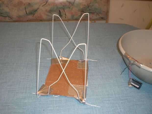 Lo siento no tomar la mejor foto de esta parte, pero creo que es bastante fácil de hacer. Sólo 4 perchas de doble por la mitad y con cinta adhesiva como se muestra en la imagen. Use la escuadra de cartón como la base del tazón de fuente. Usar un montón de cinta adhesiva también!