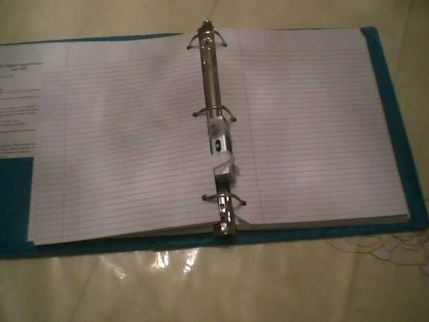 Decidí poner la grabadora en el centro de la carpeta, para que los anillos de metal protegerlo cuando lo cierre, creo que es la mejor opción, pero usted puede experimentar con él.