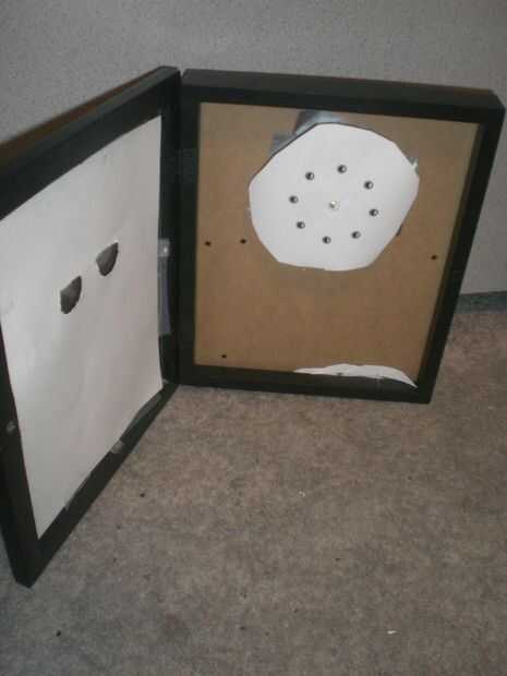 Cinta el cuadro con los agujeros para los ojos cortar y cinta adhesiva en el interior de la tapa de la caja de la sombra.