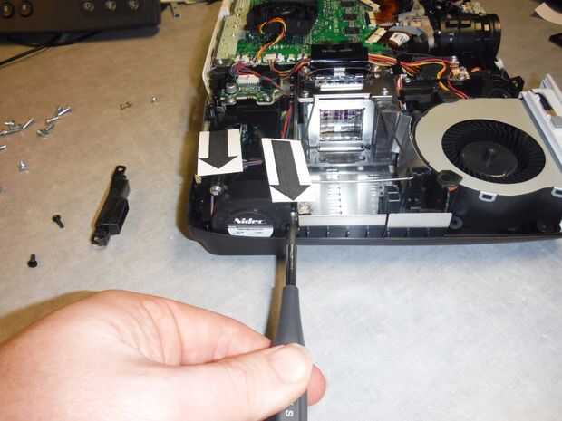 Retire los dos tornillos negros que el ventilador superior. La parte posterior se atornilla por el ventilador y el frente es un soporte de boquilla para dirigir el flujo de aire directamente sobre el foco cuando está montado.