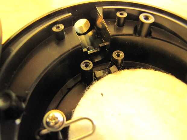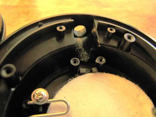 Moler por el canto del plástico en la carcasa del auricular donde se sienta el alivio de tensión para permitir que los cables de audio caber a través.