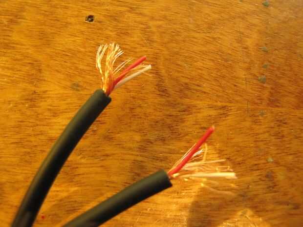 Tira de aproximadamente 3/4" de aislamiento exterior de los cables de audio, cortar y quitar los cables de protección. La tira y la lata de 1/16" de los cuatro cables de señal.
