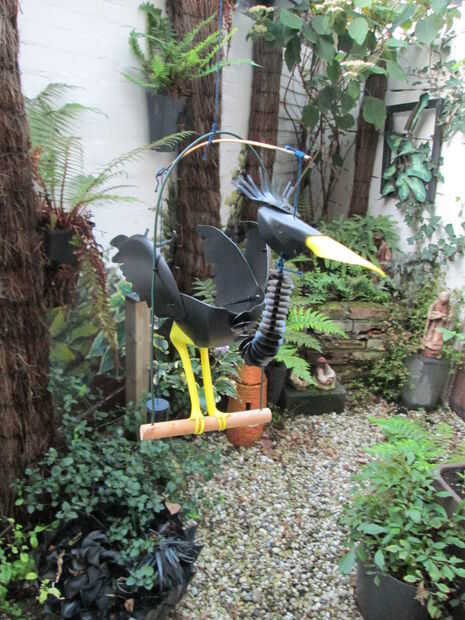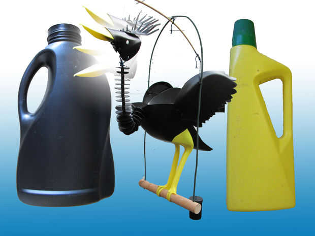 Un joven Ibis perchado sobre un soporte de parrot sacude la cabeza y da vuelta lejos, comienza asintiendo con la cabeza y se vuelve. Se trata de David Attenborough, pero aún agradable mirar. Inspirado por un carillón de viento que vi en un mercado de comercio justo. Tuve que tratar de hacer algo igual de material de desecho. Así que probé mi camino con botellas de plástico reciclados.