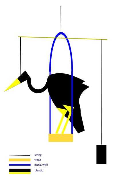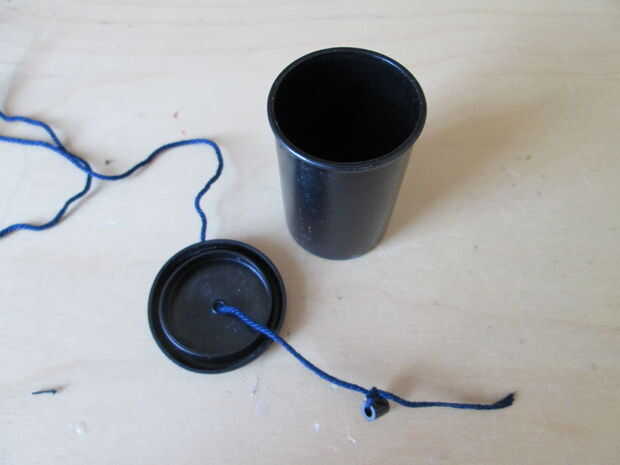 Usé una caja de película de la foto. Un agujero en la tapa y un grano en la cadena. Estos envases son un poco difíciles de encontrar estos días. Puedes usar cualquier otra botella pequeña (farmacia?) o hacer un cubo de una tapa de botella de detergente. Este recipiente debe llenarse con algo para subir de peso. Usé dos canicas, unos 10 gramos. Se pueden utilizar arena o piedras.