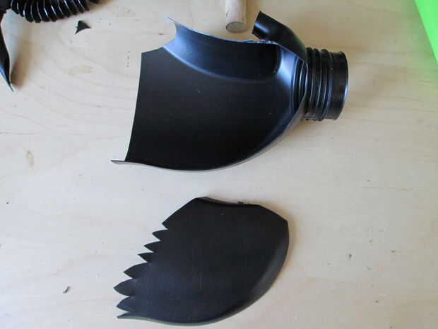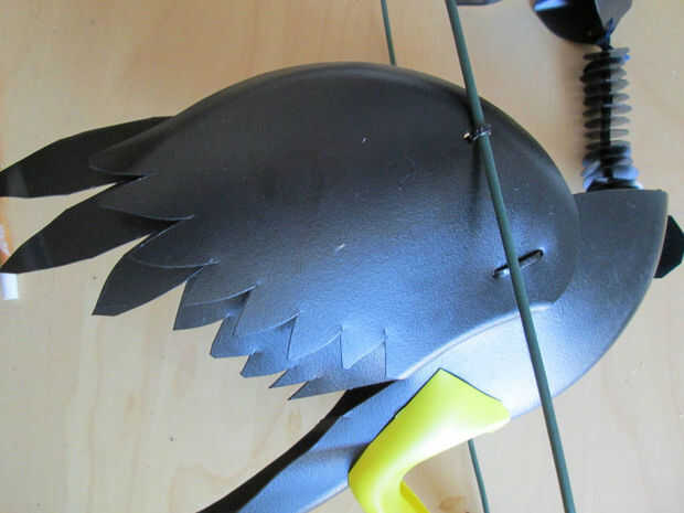 Para darle las alas un aspecto más plumoso usé la mitad superior de la primera botella (cabeza). Asegúrese de cortar no es una pieza plana, pero alrededor del borde para las alas un hombro. Otra vez cortar triángulos para representar plumas. Las piezas del ala se unen al cuerpo con un cintillo (uno inferior en la foto). El cintillo superior es conectar estas partes del soporte, para estabilizar el pájaro y evitar que se caiga.