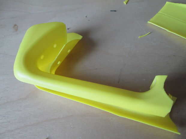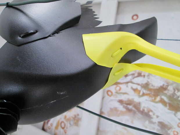 Con el mango de una botella de amarillo "(jabon verde del) he creado dos piernas. Primero se corta el asa, con un triángulo grande en la parte superior de la botella y un poco pedazo extra en el lado negativo de la manija. El mango está dividido en dos para crear dos piernas. El triángulo se ajusta perfectamente alrededor del cuerpo y se sujeta con dos ataduras. Los pies se cortan para que coincida con el palo de escoba y atados con un cintillo largo que recorre dos veces el palo como pies.