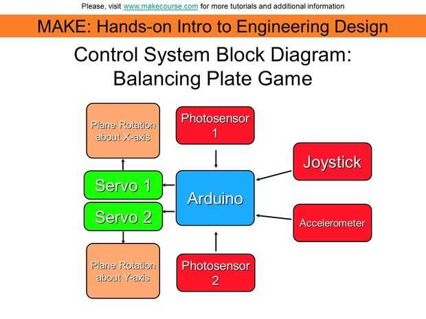 El arduino lleva las señales de los sensores en las cajas rojas y calcula las señales de pwm a actuadores (servomotores en los cuadros verdes). Los servomotores controlan la orientación de la placa.
