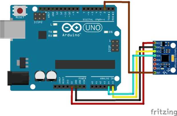 El MPU6050 se pueden comprar para baratos en este enlace. También he proporcionado un bosquejo de Fritzing para conectar el MPU6050. He proporcionado un ejemplo de código con el cual se puede probar el MPU6050. La imagen Final muestra el MPU6050 conectado al Arduino en el robot.