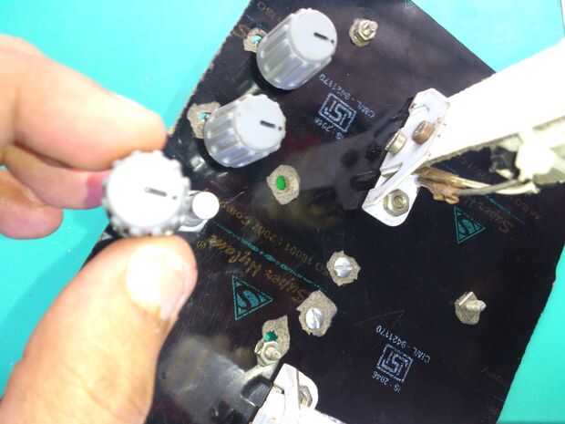 Los potenciómetros de la inserción en los agujeros y finalmente, apriete la tuerca en el potenciómetro para fijar en la parte inferior de la base.