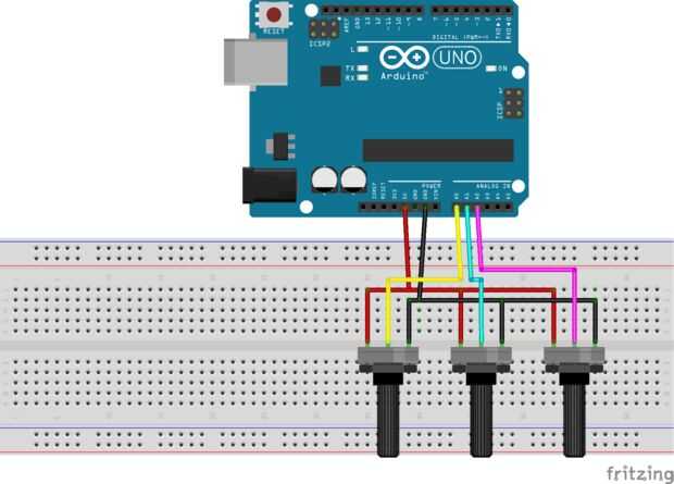 Así que usando el comando map se pueden definir los valores con a la vuelta del potenciómetro se puede dinámicamente de fijar los valores de las constantes. Esto le ahorra la molestia de cambiar los valores de las constantes en el código y reprogramación de forma repetitiva. He incluido un bosquejo de Fritzing del circuito para los potenciómetros.