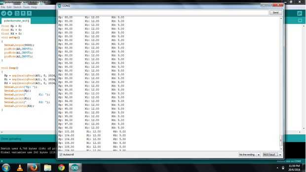 También he proporcionado un código de ejemplo para probar el potenciómetro para comprobar que funcionen correctamente. El circuito del alambre como se muestra en el bosquejo de fritzing y usted será capaz de ajustar las constantes del PID el serial monitor mostrará los valores constantes. Si todo va bien obtendremos una salida similar a la imagen final.