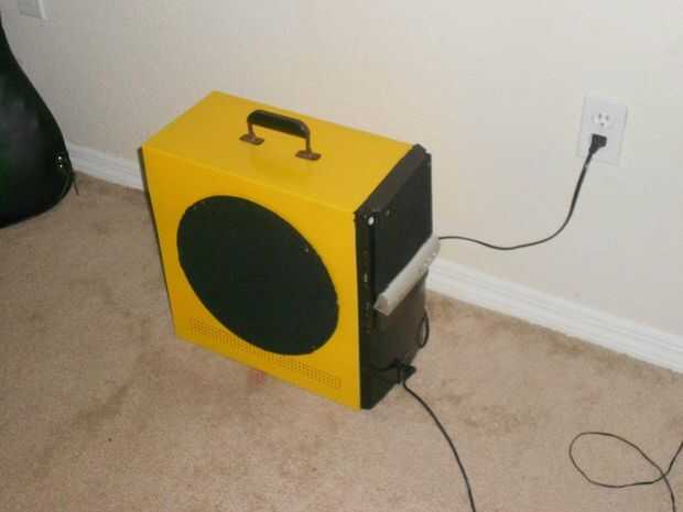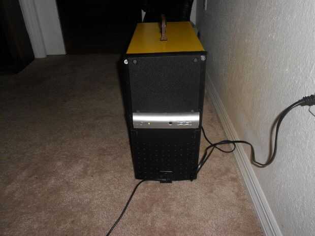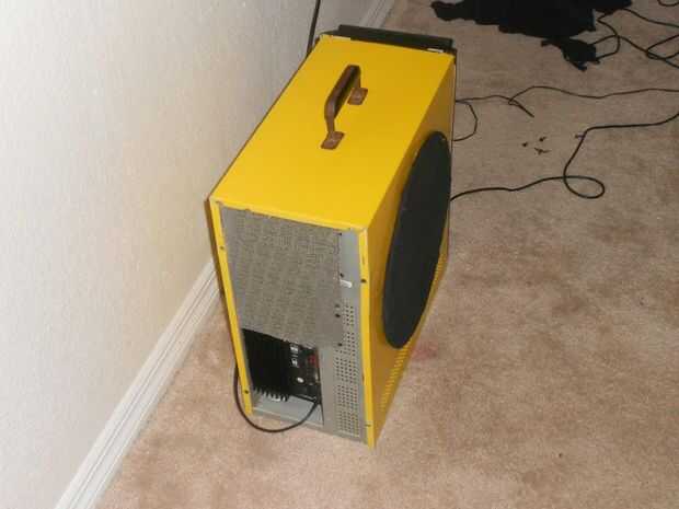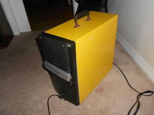 Corté un agujero abierto en la torre de ordenador con una amoladora y y pintado de amarillo. Entonces tomé el amplificador sub