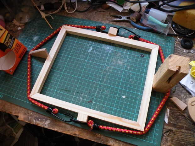Para fijar las articulaciones, había adaptado ligeramente el molinete español y envuelto los marcos en cuerdas del amortiguador auxiliar, con madera de desecho extra en lugar para aumentar la tensión.