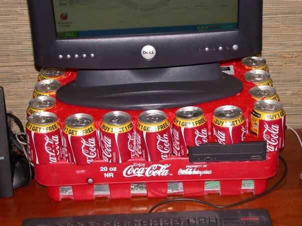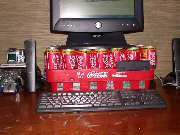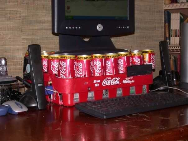 Tomar todas las latas corte y deslizarse sobre el exterior de la espuma de poliestireno. Debe ajuste todos bastante bien, hacer ajustes si es necesario! Si hay cualquier pintura blanca mostrando la espuma de poliestireno con una pintura roja. Cubrí la parte superior con la parte de la caja de Coca-Cola. Poner todo junto y coloque a su monitor en la parte superior la tapa recién hecha. Esperemos que compraron una pieza fuerte que pueda soportar el peso de un monitor.