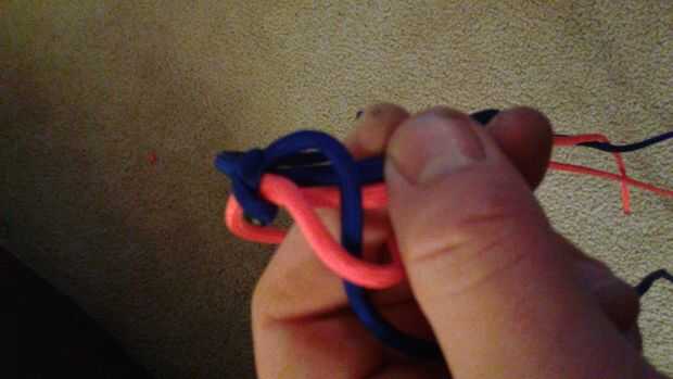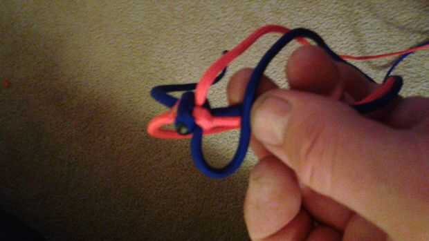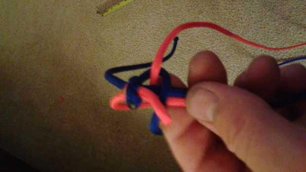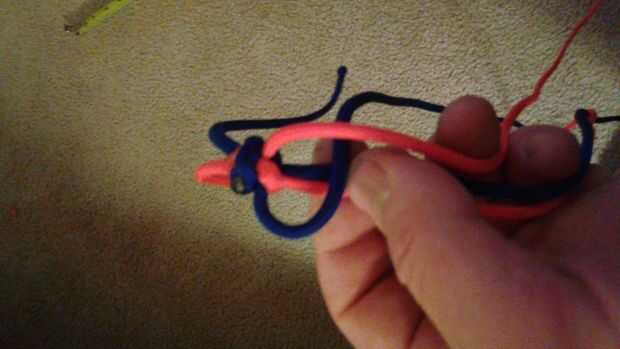 Ahora nos atará el patrón COBRA por toda la longitud. Excepto vamos a interrumpir el patrón para formar el mango y más abajo el cierre. Con el patrón de color ilustrado tome la línea azul largo y dóblela sobre el frente de las líneas del centro (core). La línea naranja entonces envolverá sobre y debajo de la línea azul como se ilustra. La naranja se vaya detrás de las líneas de centro y tire a través del bucle de la línea azul en el lado opuesto. Usted se tira 35' de la línea a través de esta abertura por lo que toma tiempo y práctica para perfeccionar el método. Esta correa todo tendrá más de una hora para atar incluso cuando se el proceso debido a la longitud de las cuerdas con que tienes que trabajar. Ahora nuestra cola azul está a la izquierda y repetimos el proceso. Línea azul en la parte delantera, naranja de línea en la parte superior y tirado detrás de las líneas de centro, luego por el lazo azul en el lado izquierdo. Ver fotos de la ayuda. Si esto no tiene sentido tratar de buscar patrón cobra en este sitio para ver si otros mejor ilustrar cómo hacer el patrón.