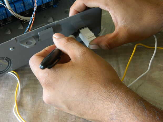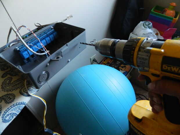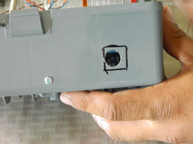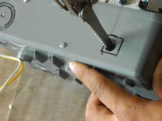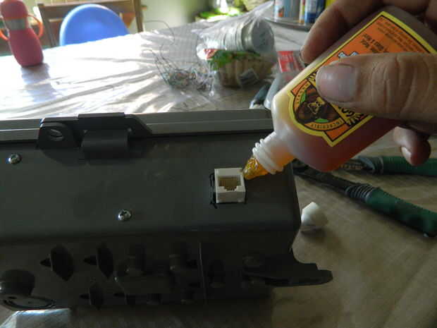 Traza el acoplador, perfore hacia fuera y acabar el corte con su práctico multiusos, pegamento en su lugar, el acoplador de cat5 es para los interruptores en la BaleScoop. Los cables van a---2 para el enganche que hace pivotar (abierto y cerrado), 2 para el cargador (arriba y abajo), 1 cama abajo, 1 para la bala en el cargador y 1 para contar al segundo hasta la última bala, y el último es 5vlt para completar el citcuit.