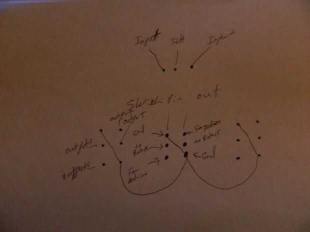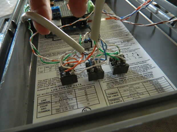 7 los cables cat5 del alambre a los pines de salida terminal de escudo y los otros extremos a los conmutadores de la soldadura. Estos interruptores están en el circuito para tirar de los relés a ground(ON). Asegúrese de que son soldados a los pines correctos. 2 hilos y un terreno en 1 (necesita a puente de la tierra a todos los interruptores) y 2 cables saliendo del interruptor a la placa de relé (interruptor controles 2 relés).