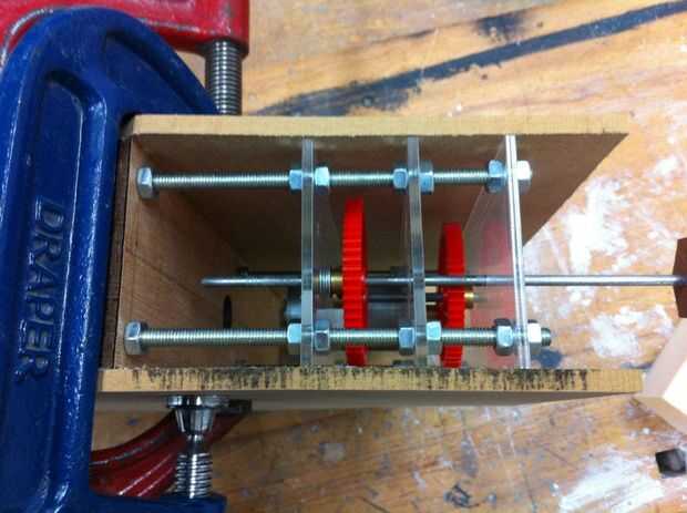 El equipo de 40T fue unido al motor, el engranaje de 50T mallas con eso de la varilla de 4 mm más pequeño. En la misma barra es un engranaje que mallas de 10T con el engranaje de 60T en la varilla más larga, para que las cuchillas se unirá a.