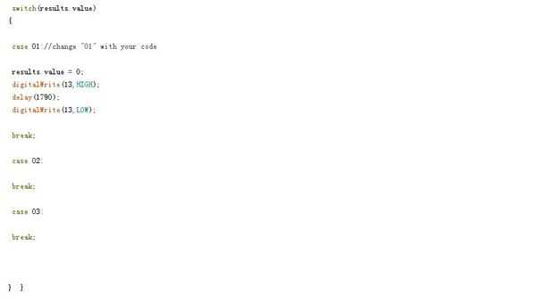 Entonces, abrir el bosquejo del alimentador del perro IR y subir a la Arduino.You vio un montón de código, encontrar el 'caso' como la imagen que os adjunto arriba entonces cambiar la '01' con el código que tienes (por ejemplo, del caso 2027:). You can add as many 'case' as you want by changing the value of the number after the 'case' as you did before, the 'case' was actually a part of the SwitchCase statement if you don't know what SwitchCase statement is , here is the tutorial https://www.arduino.cc/en/Reference/SwitchCase .