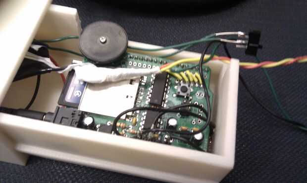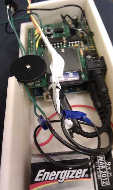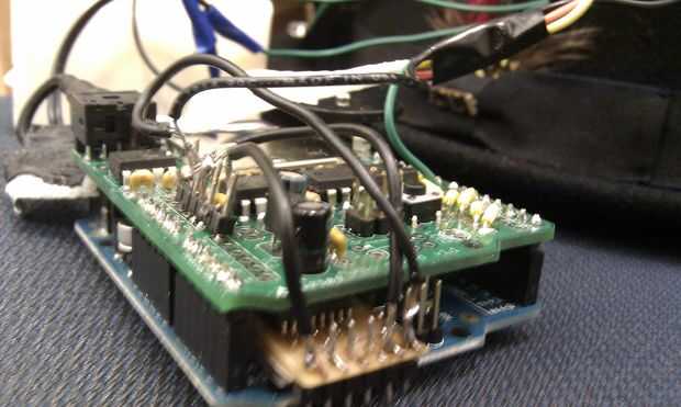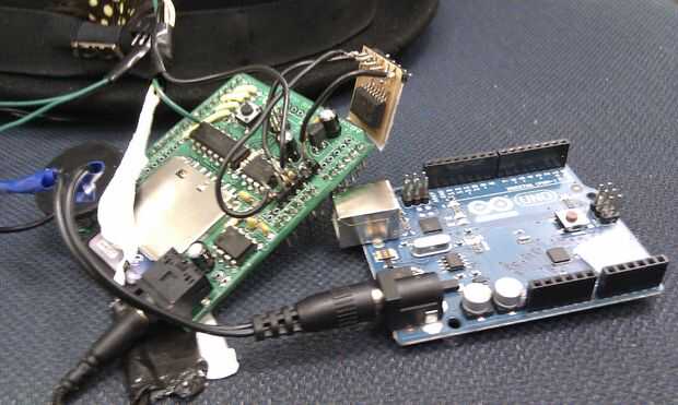 Esto se logra por un Arduino con un protector de la onda para jugar música y un acelerómetro para calcular la velocidad del corredor.