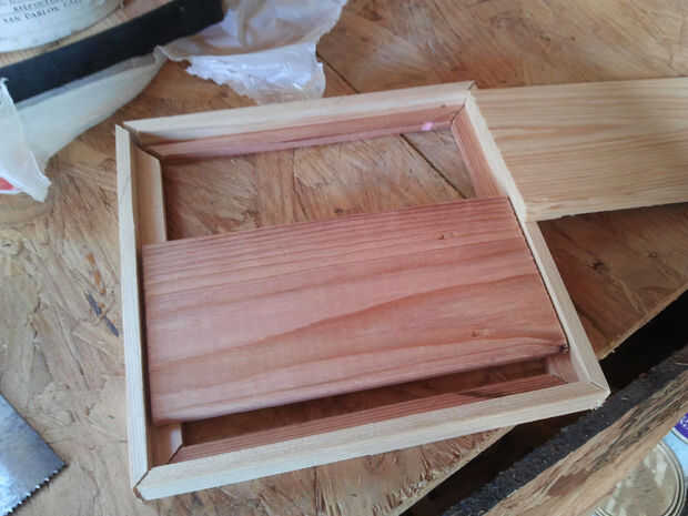 Piezas de ocho "L" de 8" de largo fueron cortar a 45 grados para formar un marco alrededor de dos 0.3" x3.5 "x7" de lado a lado.