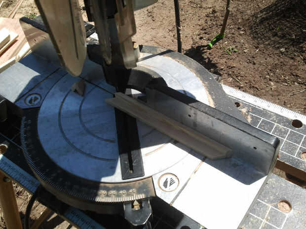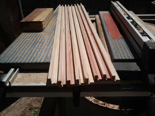 32" pieza de 2 x 4 fue rasgado por la mitad para forma dos 0,7" x3.5 "piezas. Éstos entonces fueron ripeados para formar seis aproximadamente 0,7" piezas x0.7"x32". El ripeo fue hecho de corte a cerca de la mitad la longitud de la Junta, y luego los bancos la tabla 180 grados y terminar el corte desde el otro extremo. Esta manera, las manos permanecía lejos de la hoja de sierra.