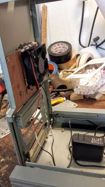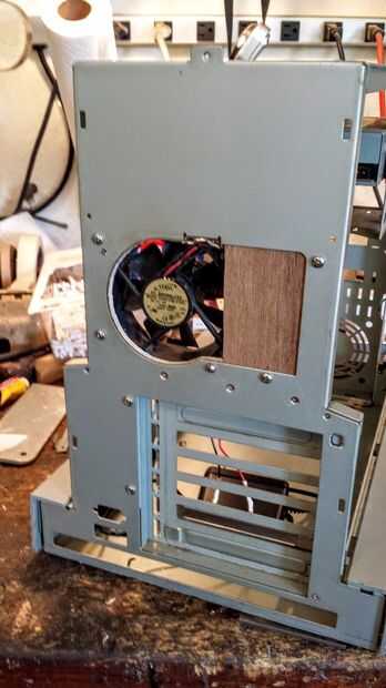 Aunque el xito es fanless y genera muy poco calor, decidí añadir construir un extractor en la parte superior trasera de la máquina para asegurarse de que no hay calor dentro de la caja. Hice un panel de madera para cubrir el área donde la fuente de alimentación originalmente fue conectado a un extractor silencioso y conectar el ventilador para una verruga de la pared de 12v que tenía en mi caja de chatarra.