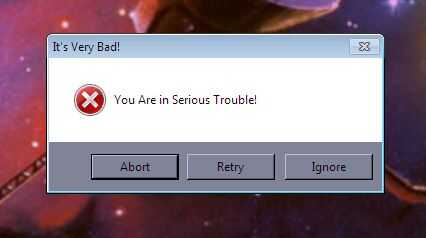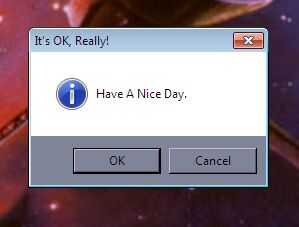 Cuando su víctima hace clic en el acceso directo, obtendrá un cuadro de mensaje con uno o más botones, pero no importa de qué botón hace clic (incluso el botón Cerrar!), recibe otro mensaje aún más ominoso. Finalmente, después de hacer clic frenéticamente, él obtendrá los mensajes, "Solo es broma!," "Allí está nada mal," "Have a nice Day!"