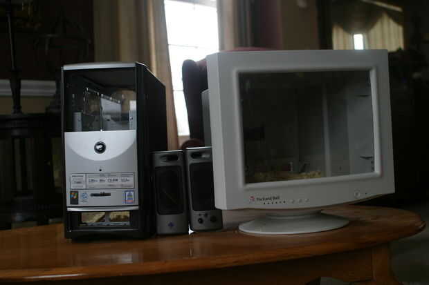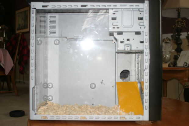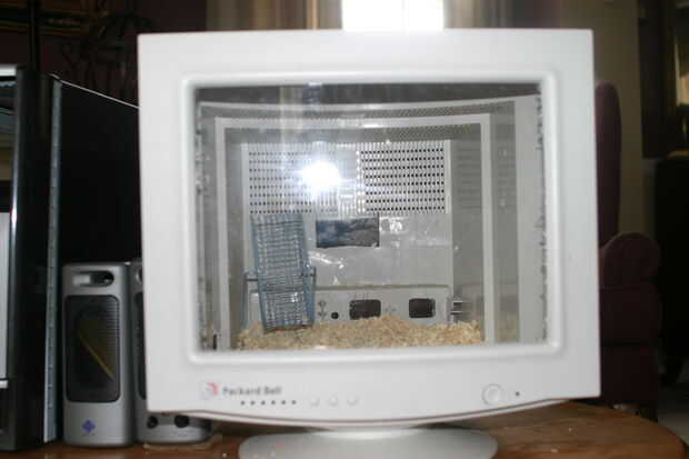 Mis padres han estado ahorrando equipos muertos, altavoces, monitores y un montón de otros trastos inútiles en nuestro sótano durante mucho tiempo desde más allá de las necesidades del negocio. Hasta ahora, ha a estado tomando espacio así que decidí hacer uso de al menos una estación de trabajo de ordenador viejo convirtiéndolo en una jaula de jerbo! Completa con un monitor, torre de ordenador y altavoces como un túnel entre los dos.
