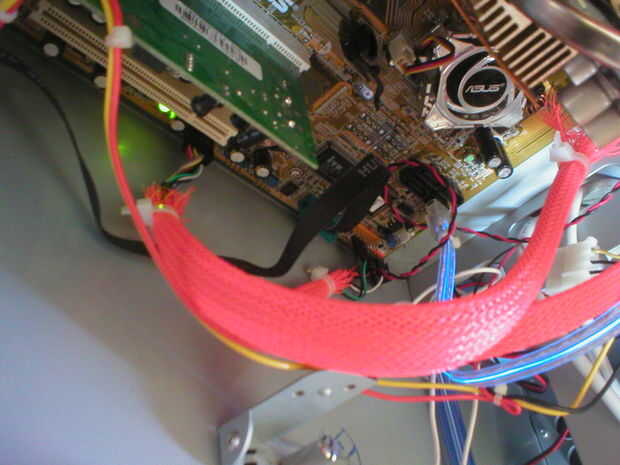 Desconectada primer todo de la madre del tablero excepto el ventilador de la CPU (que es suponiendo que usted puede devolver todo juntos). Solo tuve 4 pies estaba limitada a mi elección de cables, tomé mi conector de 4 pines, cables de LED/altavoces y otro cable desconocido (sé donde su va no lo que). De todos modos sólo se deslice un extremo de la manga sobre el cable hasta que han alcanzado el deseado legnth (mina era cuanto podía ir) entonces cortar el manguito en el extremo de su cable. Agregar bridas para evitar que la manga se deshilache y listo, bastante simple.