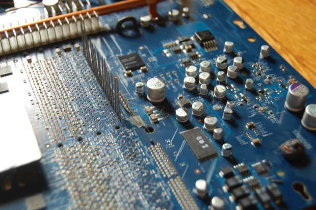 Los elementos de refrigeración ofrecieron una declaración audaz gráfico, pero también me encantaba la serie de condensadores (esos cilindros plata pequeña), como tantas fábricas de productos químicos en el NJ turnpike. Lamentablemente estos elementos estaban en lados diferentes de la placa base, así que arrancaron los condensadores uno por uno y pegados al lado opuesto. Me encantaron los circuitos y cables conectando una parte de la placa base a otra, así que he añadido algunas de mis propias con algunos cables eléctricos y cobre. Me pegó una línea de pins a través de algunos de los cientos de pequeños agujeros, creando un muro reluciente y casi invisible, añadido un chip verde anticuado que tenía dando vueltas para contraste e incluso un ojo de la cerradura miniatura y la manija de la antigua construcción de casa de muñecas de mi sobrina fuentes. Mezcla bien en. Estos circuitos son una entrada en otro mundo y espacio: es sólo el montaje allí estaría la perilla de una puerta y una llave.