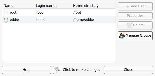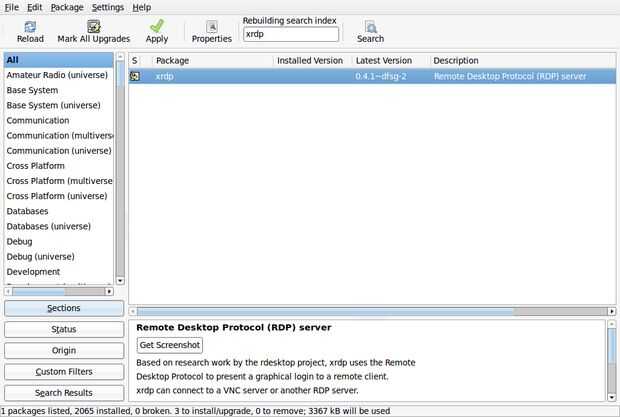 Usted necesita tener una contraseña de root o sudo. Al configurar el sistema, esos detalles se presentaron entonces. Usted probablemente querrá configurar usuarios (también conocido como login) y contraseña para todas las personas que quieran utilizar su red (a través de sistema > Administración > usuarios y grupos). Hice una captura de pantalla de ubuntu, pero debe ser similares. Entonces usted necesita agregar el software. Usando el gestor de paquetes (sistema > Administración > Gestor de paquetes synaptic) debería ser fácil. Necesita buscar xrdp. Haga clic en el cuadro de configurar para la instalación y luego de acuerdo a cualquier otro software que quiere cargar. Entonces viola listo.