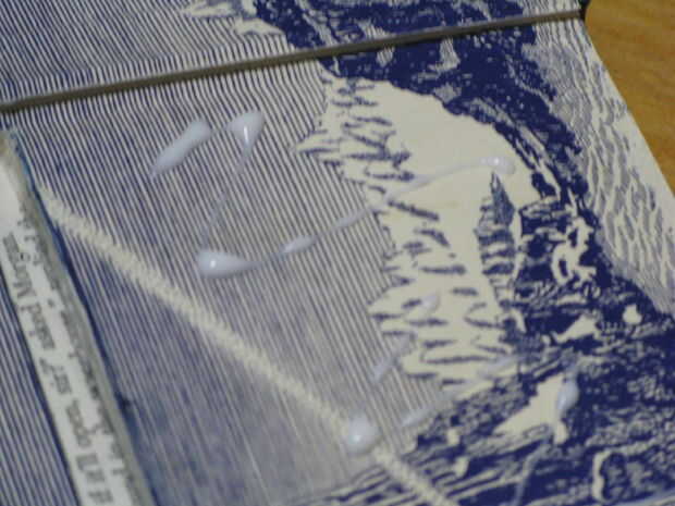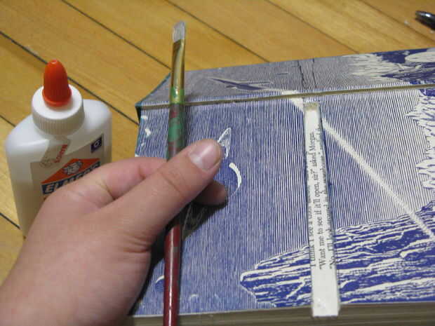 Una vez que termines corte, coge el pegamento y cubrir los lados de su compartimiento poco. Luego Unte pegamento en el resto de la página y cerrar el libro. Déjalo debajo de una pila de libros otra vez.