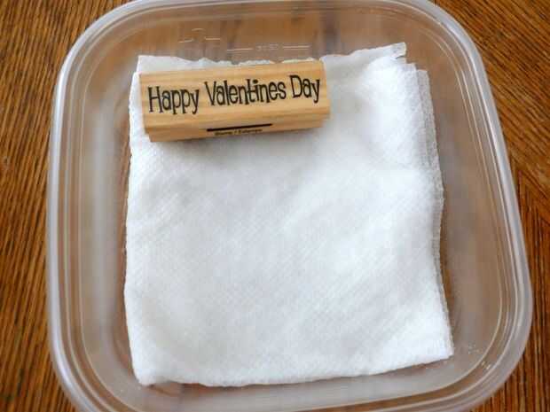 tengo una foto de la toalla de papel húmeda coloqué dentro de un recipiente de plástico. Esto es Cómo guardo mis sellos limpia, especialmente cuando se trabaja en varios proyectos. Junto a él, no se muestra en una foto es una toalla de papel seco, lista para secar el sello húmedo.