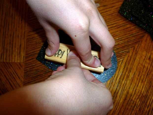 Si no tienes un sello de ' feliz día de San Valentín ' (como muestro aquí), entonces sugiero escribir "Feliz día de San Valentín!" con la pluma de plata del gel en la parte "frontal", enfrente de la ubicación de la bola. Si opta por escribir esto, asegúrese de que la bola de apertura está en el lado opuesto de la escritura.
