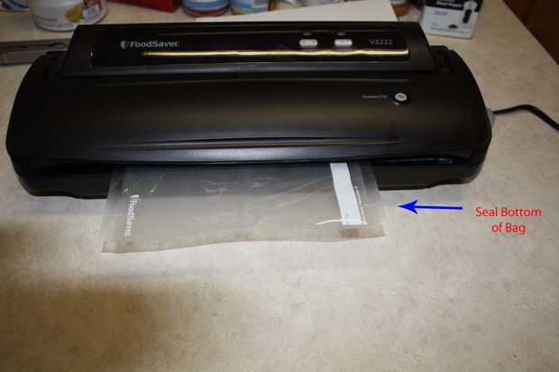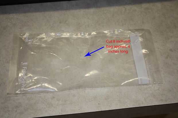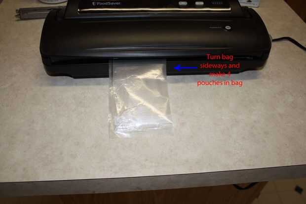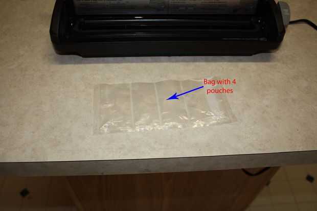 Usé 5 bolsas para este DIY de MRE. La primera bolsa fue cortada aprox. 3 1/2 pulgadas largo, sellado a lo largo del borde inferior y luego divide en 4 compartimentos.
