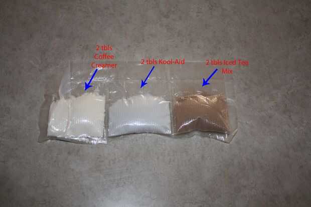 En los otros 3 compartimentos bolso puse 2 cucharadas de crema de café, 2 cucharadas de Kool-Aid y 2 cucharadas de mezcla de té helado y luego, usted adivinado, sellado todo!