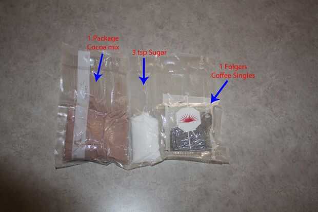 En una de las bolsas de 3 compartimentos hiciste Coloque un paquete de mezcla de cacao, 3 cucharaditas de azúcar y un café solo en la comaprtments y cerrar bien. Personalmente no uso el paquete original de la mezcla de cacao porque si os fijáis, la mayoría de ellos tienen una pequeña muesca en ellos para hacer más fácil que les abra y no es 100% hermético.