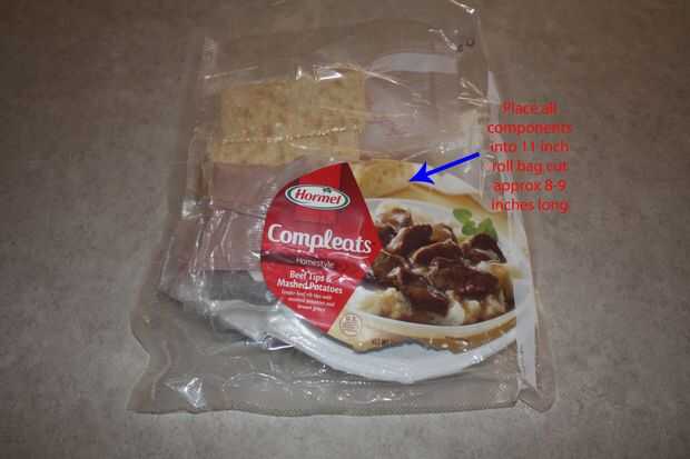 Cortar una bolsa de rollo 11 pulgadas aprox. 10 pulgadas de largo y sellar la parte inferior. Coloque un Pop-tart, comida principal, las bolsas pequeñas y una bolsa grande de tal manera minimizar el "dead space" y proteger los elementos más frágiles (galletas principalmente) y sellar todo.