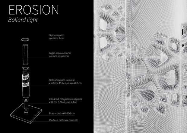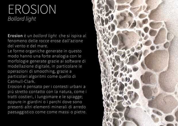 Le forme organiche generar de este modo hanno una analogia forte con le morfologie generar grazie ai software di modellazione digitale, particolare le operazioni di alisar, grazie un algoritmi particolari vienen quello di Catmull-Clark. Erosión è pensato por me contesti urbani una più stretto contatto con la natura, viene tratti costieri, i lungomare e le spiagge; oppure en giardini o i parchi dove sono puré altri elementi minerali di arredo paesaggistico venga venga massi o pietre.
