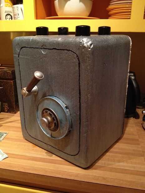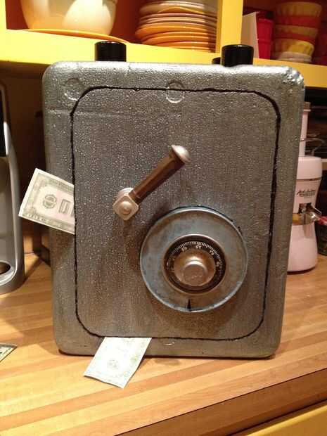Primero he creado una puerta imaginaria para la caja fuerte trazo y corte refrigerador usando un cúter - corte un poco pero no completamente a través un esquema de uno en la parte inferior de la espuma de poliestireno grueso. Luego, pinté el refrigerador gris metálico usando una pintura acrílica. Entonces hice un marco circular de la esfera utilizando una tapa de caja de cartón redonda que pinté del mismo color que la caja fuerte, agregando un pequeño pintado flecha negra en - una vez que estaba seco, jodido el disco directamente en el centro de este marco redondo con un tornillo y restos de núcleo de espuma extra de refuerzo. Hice 4 pies para la caja fuerte usando spray de tapas de plástico (de 4 botellas de desodorante) pintados de negro y fija los y el cuadro de esfera redonda seguro del enfriador en sus lugares apropiados por trazar y cortar sus contornos ligeramente en la espuma de poliestireno usando un cortador de la caja, encajar en la espuma un poco por la presiona y luego usar pegamento blanco a lo largo de los bordes para mantenerlos en su lugar (no olvide dejar un tiempo de secado apropiado!). Os adjunto el controlador seguro usando un tornillo desde el interior con restos de espuma y las arandelas como refuerzo. Finalmente, hice una correa elástica para sujetar el falso seguro a mi cuerpo diagonalmente a través de mi espalda por corte, por lo mis brazos podrían ser libres realizar el "transporte" se mueve durante el desfile, harían temblar a la "caja fuerte" que fue tan fuerte que mi ladrón no podía soportar el peso, alzamiento arriba dramáticamente involucrar mi barbilla en la realización , mover mis manos arriba y abajo del lado, etc.... Para acoplarlo, corté un 1" por la raja en la parte superior y lateral del refrigerador/segura (usted decida donde es lo mejor para usted, así que es cómodo), a ancho suficiente para alimentar en una correa elástica que luego ajustado y asegurado desde el interior usando un broche aprietapapel grande sobre un taco de madera a ambos lados de la correa. Por último, trazó el contorno de la puerta falsa de la caja fuerte con un rotulador negro para poner de relieve la falsa apertura y trocear un dinero falso y había colocada alrededor de la puerta falsa usando pegamento blanco más.