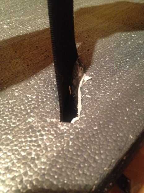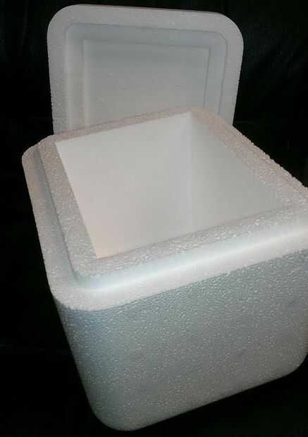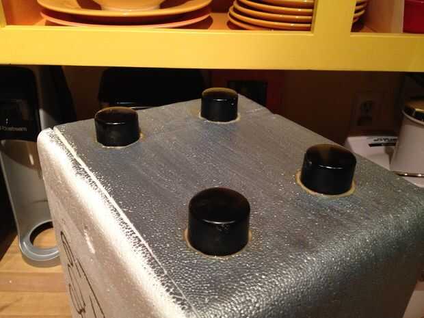 El primer paso fue hacer la caja fuerte usando un poliestireno con bordes redondeado refrigerador. Tengo la nevera gratis de mi tienda de mascotas del barrio (donde consiguen las entregas de alimentos para mascotas congelados frescos). Lo primero recordar que espuma de poliestireno no puede ser aerosol pintado o caliente pegado como la espuma de poliestireno se derretirá, así que tienes que utilizar materiales suaves que son menos "instantáneos" - así que planee con anticipación! En estas fotos la caja fuerte es sobre todo boca abajo porque la pega que tomó tanto tiempo para secar.