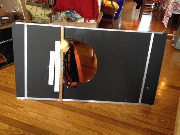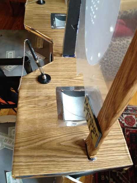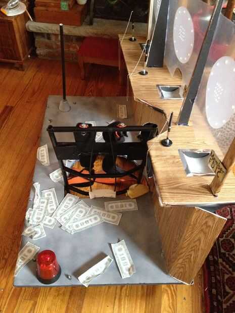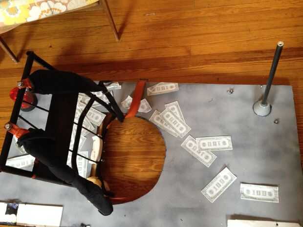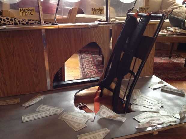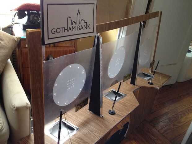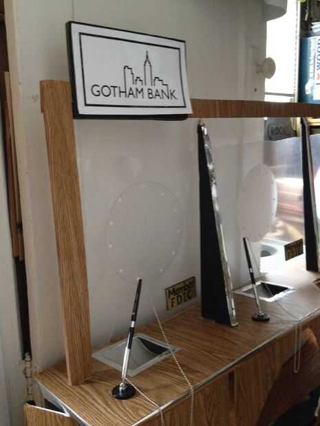 Luego me trasladé al marco del traje/flotador y crear el Banco. Hice un marco de aluminio ligero para apoyar el "set" con dos pedazos de ángulo recto largo y 3 travesaños (aluminio 2, uno de madera), perforar con un metal taladro bit y utilizando tuercas y tornillos para fijarlos. En la barra transversal (de madera) media, os adjunto un antiguo marco de metal mochila (con 3 "L" los soportes, tornillos y tuercas) para que poder usar cómodamente toda la escena. La planta y el telón de fondo fueron hechas de grandes piezas de espuma. El piso fue pintado gris y me corte un orificio de mi cuerpo encajar en frente el marco de sujeción de la mochila, y el telón de fondo, que tenía 3 Banco cajero ventanas de plástico transparente flexible, tenía un núcleo de espuma de base y el marco, creado por puntuación y doblar la base de la espuma en forma de cabina de teller y fijar con pegamento caliente. Una vez que fueron instalados, cubrí las cabinas con paneles de madera falso papel de contacto. El piso y 3 cabinas fueron fijadas a la estructura de aluminio mediante tornillos y tuercas y las arandelas grandes y pegamento caliente como refuerzo, para que no corte a través del núcleo de espuma. Trozos pequeños de espuma se utilizaban para crear bordes de privacidad separa las ventanas de teller (triángulos de ángulo recto alto), y un estante largo con agujeros de paso a través de la ventana (para el cajero para el intercambio de dinero a través de) fueron hechas usando espuma de base y secciones de corte centro de un gran envoltorio de papel cartón (pintadas de plata – esencialmente como papel higiénico gigante). El logo falso de banco ("Banco de Gotham") fue unido a una pieza rectangular de base de la espuma con pegamento de montaje spray, y que estaba caliente pegado en la parte superior del marco. Las 3 plumas de cadena idéntica con el titular de pegan a la parrilla y las muestras de "Miembro FDIC" oro en cada ventana eran una gran manera para hacer que cada cajero parezcan legítimos.