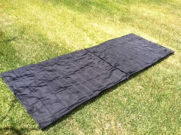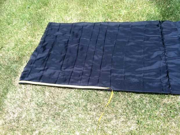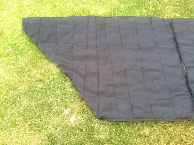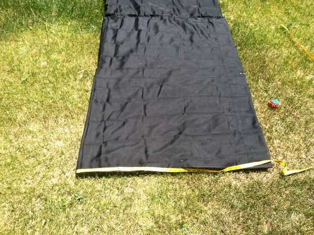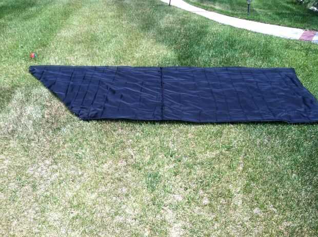 A continuación doblar el panel por la mitad para que tengas un rectángulo 117 "x 42". En el lado que tiene los bordes libres (enfrente del borde del doblez) medida en 30" a lo largo del borde largo. En el mismo lado mida 4" hacia abajo desde el borde doblado. Cortar una línea recta de una marca a la otra asegurándose de cortar ambas capas. NO REPITA ESTE PASO EN EL OTRO LADO. Una vez que este borde se cose para arriba se sienta a los pies de la hamaca. Permite un pequeño agujero de suspensión venir a través. el lado opuesto se deja sin cortar para que pueda moverse la red sobre el mismo una vez que estés en tu hamaca.