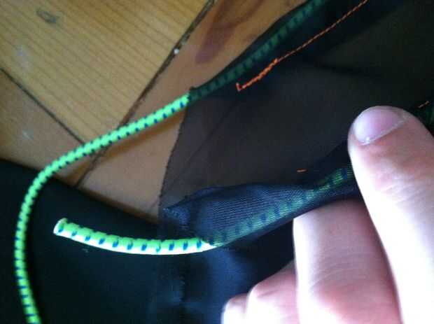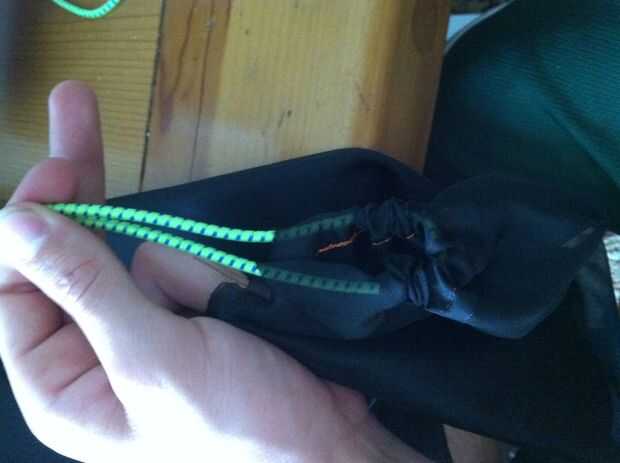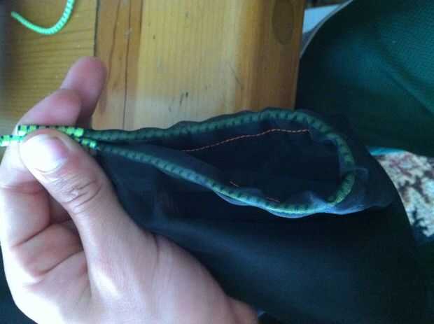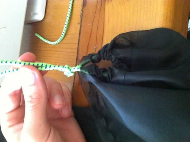 Alimentar un extremo suelto de la cuerda del amortiguador auxiliar en el dobladillo del gran agujero hasta que salga por el otro lado. Cortar el amortiguador auxiliar por lo que hay alrededor de una pulgada del bungee colgando de cada lado del dobladillo. CUIDADOSAMENTE con el encendedor desde el final del bungee que se cortó. Introduzca los dos extremos sueltos de lo bungee en el bloqueo del amortiguador auxiliar y atar un nudo en el otro lado. Este bloqueo del amortiguador auxiliar se utilizará para ceñir el orificio grande de cierre una vez que estás dentro.