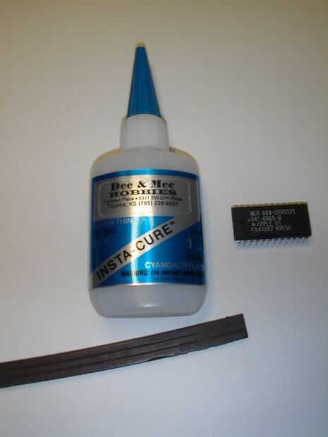 3. pegamento. He utilizado CA (superglue), usar lo que quieras. Superglue conozco obras, cemento de contacto casi definitivamente funcionará, epoxi podría funcionar, pegamento de Elmer de la escuela no funciona.