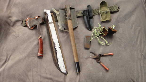 Estas son sobre todo herramientas para la protección y campo de configuración. Piedra de afilar las tijeras de podar será en la bolsa, pero el resto de los elementos a usarse en el cinturón. En caso de que el Apocalipsis es de la clase de zombie, voy a tener un sistema justo de armas cuerpo a cuerpo, pero sería una lástima perder una herramienta para el bien en el cráneo de los muertos. Si eso sucede sería mucho más difícil de construir trampas para campamentos y tal. El cinturón es una clase de utilidad militar y es rápido. E-tool, reemplacé el mango en un tiempo atrás. Pinté mi machete blanco porque dejaba perder en el Monte (y nadie más tiene un blanco uno como este). La eslinga que hice de un viejo parche de cuero y alguna cuerda fina. Para él se trata de estilo militar para que coincida con la correa. Hachette, funciona bien.