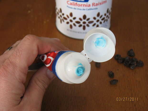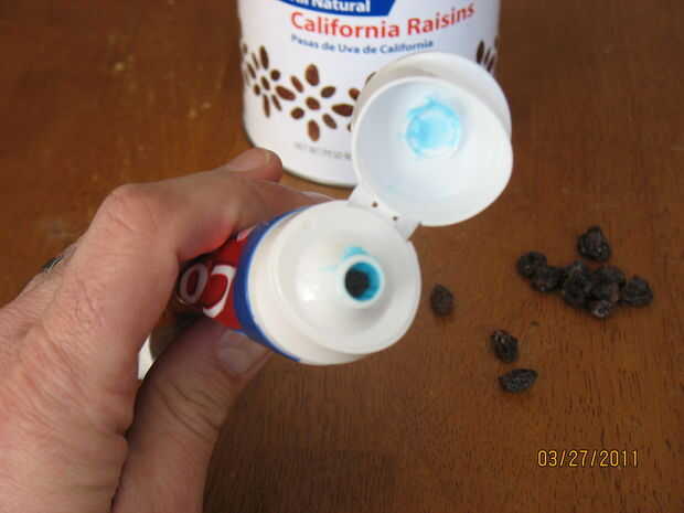 Simplemente inserte una pasa en el final de la pasta de dientes.  Me parece que una pasa más pequeño funciona mejor.  Empuje la pasas mientras exprimiendo algunos dentífrico para cubierta u ocultar las pasas de uva.