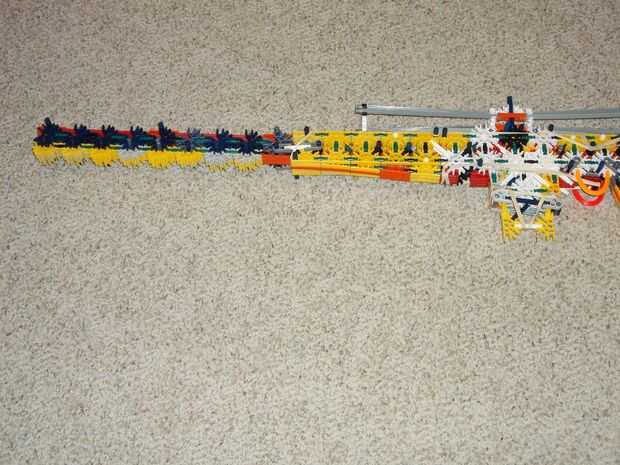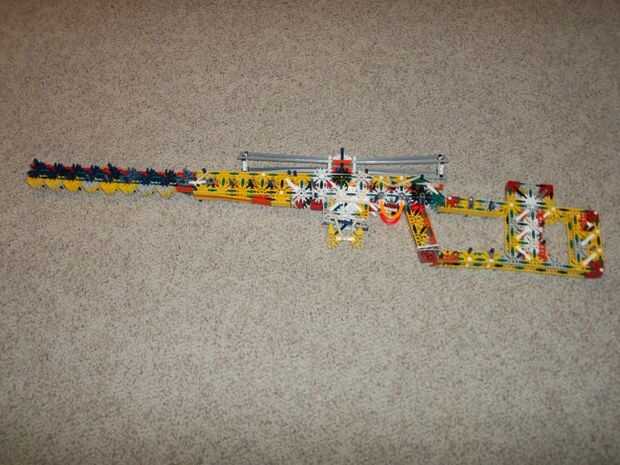 esta es el arma más poderosa de K'NEX creo que porque puede perforar 2 cerveza o COLA puede y destruir disco compacto fácilmente debido a la muy fuerte 4 gomas (yo uso 2 ligas diferentes) también incluye una gran revista para 5 K'NEX largo gris afila